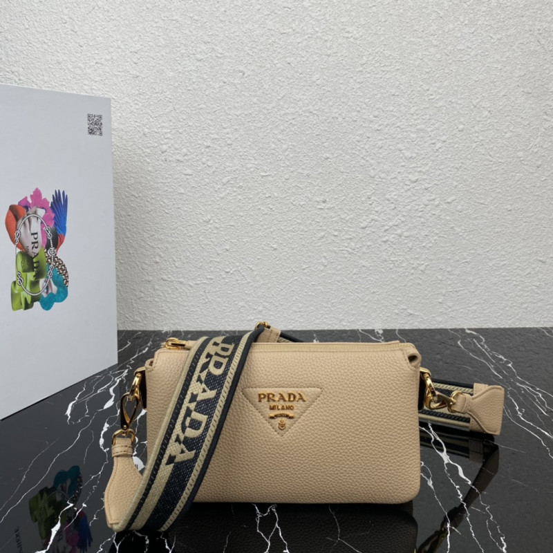 DetailCrafted from supple leather, this compact shoulder bag embodies the House's mastery of craftsmanship and features a new interpretation of the triangular logo, with topstitching and Prada's metallic monogrammed logo shimmering in the center. With three compartments and a detachable, adjustable shoulder strap emblazoned with a beautifully embroidered logo, this bag is masterfully crafted to express a feminine image.